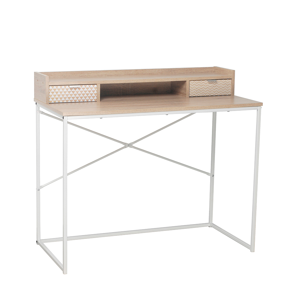 Το γραφείο Nak προσφέρει κομψότητα και πρακτικότητα, ιδανικό για έναν σύγχρονο και λειτουργικό χώρο εργασίας. Είναι κατασκευασμένο από επένδυση μελαμίνης σε ανοιχτόχρωμη φυσική απόχρωση ξύλου δρυός (Sonoma), αποπνέοντας ζεστασιά και διαχρονικό στυλ.Διαθέτει δύο συρτάρια στην ίδια απόχρωση, με διακριτικά pattern στις όψεις τους, προσφέροντας αποθηκευτικό χώρο για την οργάνωση εγγράφων και αξεσουάρ.Η σταθερή βάση του από λευκό μέταλλο προσθέτει μια μοντέρνα πινελιά και εξασφαλίζει ανθεκτικότητα.Το Nak είναι η ιδανική επιλογή για όσους επιθυμούν να συνδυάσουν λειτουργικότητα και minimal αισθητική στο γραφείο τους.