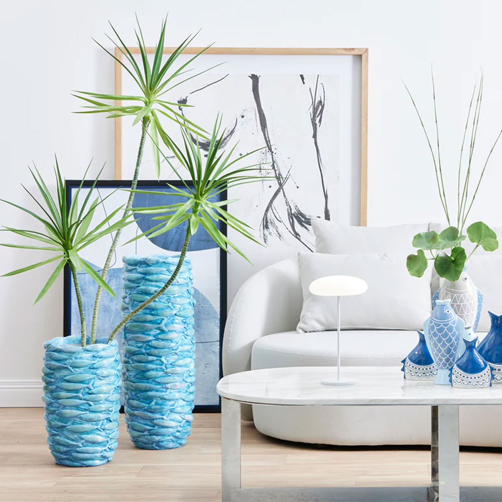 Το βάζο Ocean, κατασκευασμένο από ανθεκτικό polyresin, είναι ένα μοναδικό διακοσμητικό κομμάτι εμπνευσμένο από τη θαλάσσια ζωή. Ο ανάγλυφος σχεδιασμός του, με απεικόνιση ψαριών σε αποχρώσεις του μπλε, θυμίζει καλοκαιρινές στιγμές δίπλα στη θάλασσα. Το βάζο Ocean είναι ιδανικό για να προσθέσετε μια ιδιαίτερη πινελιά σε χώρους με καλοκαιρινό ή μεσογειακό στυλ διακόσμησης.