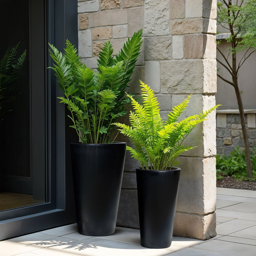 Η ONYX Γλάστρα Set 2τμχ, σε μαύρο matte κεραμικό, φέρνει απόλυτη minimal κομψότητα. Η ψηλή και λεπτή γραμμή της δίνει ύψος και αρχιτεκτονική δομή στο χώρο, ιδανική για φυτά με «κάθετη» ανάπτυξη, όπως φίκους, φτέρες ή pampas. Το μαύρο χρώμα λειτουργεί ως ουδέτερος καμβάς που αναδεικνύει το πράσινο των φυτών, δίνοντας premium και σύγχρονη αισθητική.