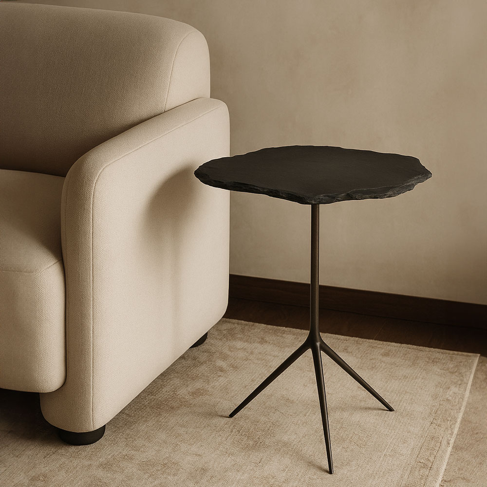 Το βοηθητικό τραπεζάκι Piedra είναι ένα μοναδικό κομμάτι με φυσική και οργανική αισθητική. Η επιφάνειά του, σε σκούρο γκρι χρώμα, θυμίζει ακανόνιστη πέτρα, προσδίδοντας έναν ακατέργαστο αλλά και εκλεπτυσμένο χαρακτήρα στον χώρο σας. Η λεπτή βάση του, σε μπρούτζινο αντικέ χρώμα, μεταλλικό φινίρισμα και τριπλό πόδι, προσθέτει μοντέρνα πινελιά και σταθερότητα. Το τραπεζάκι Piedra είναι ιδανικό για σαλόνια με μοντέρνα ή βιομηχανική διακόσμηση και αποτελεί εξαιρετική επιλογή για να αναδείξετε τα αγαπημένα σας διακοσμητικά αντικείμενα.