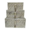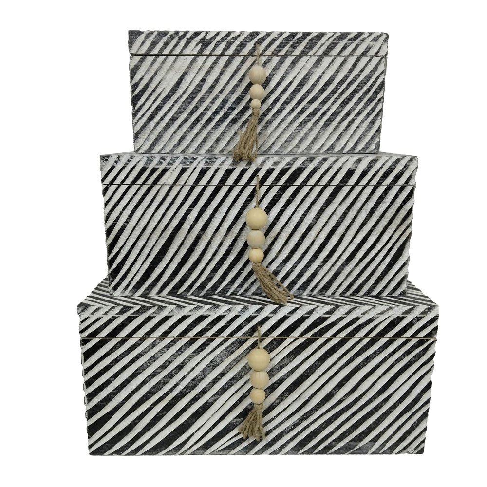 Το σετ κουτιών RONAN (64?44?30 cm) σε καφέ και μπεζ τόνους αποπνέει φυσική κομψότητα και διακριτική πολυτέλεια. Η μεγάλη χωρητικότητα το καθιστά ιδανικό για μεγαλύτερα αντικείμενα, χωρίς να χάνει το διακοσμητικό του ενδιαφέρον. Η ξύλινη κατασκευή το κάνει ανθεκτικό και διαχρονικό.
