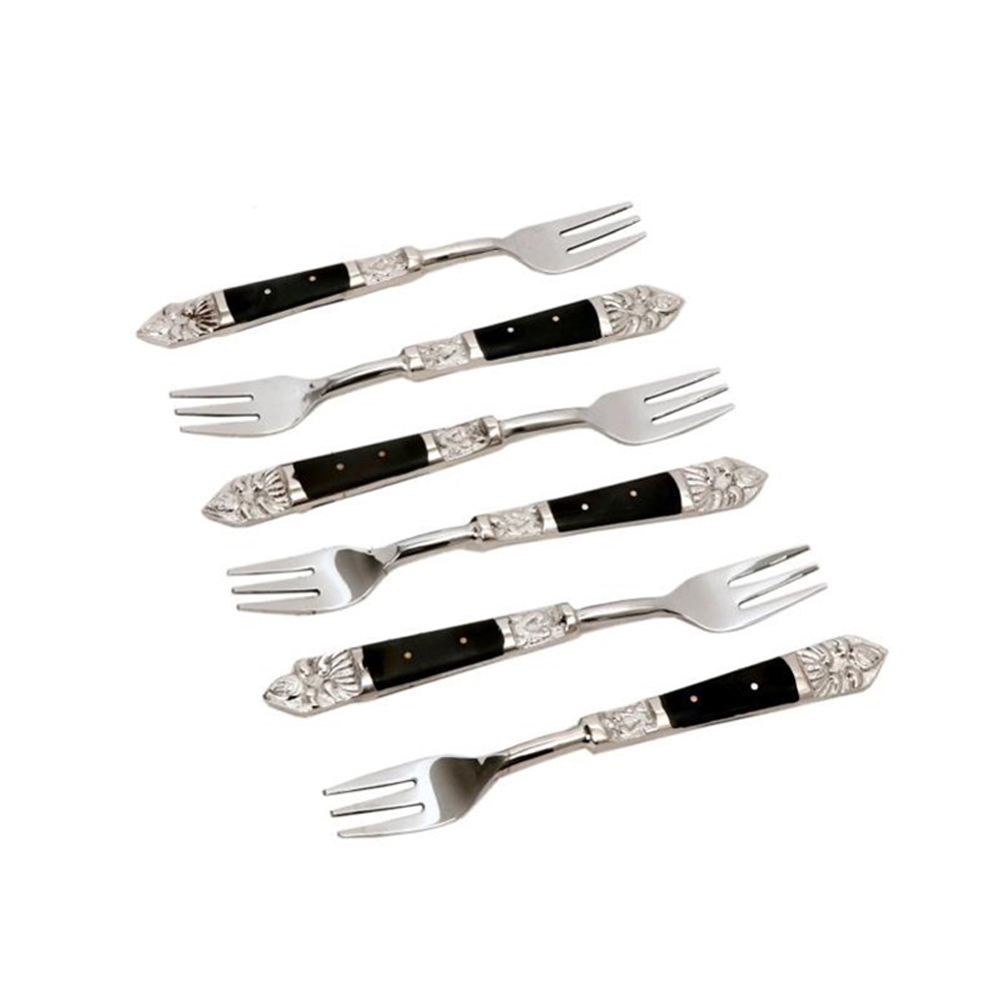 Με μοντέρνο σχεδιασμό και μαύρες resin λαβές, το ROYAL σετ πιρουνιών γλυκού αποπνέει καθαρή αισθητική και premium χαρακτήρα. Το ατσάλι προσφέρει σταθερότητα και αντοχή, ενώ η μινιμαλιστική γραμμή το κάνει ιδανικό για καθημερινή χρήση ή refined σερβίρισμα. Ένα διακριτικό αλλά κομψό στοιχείο σε κάθε σύγχρονο τραπέζι.