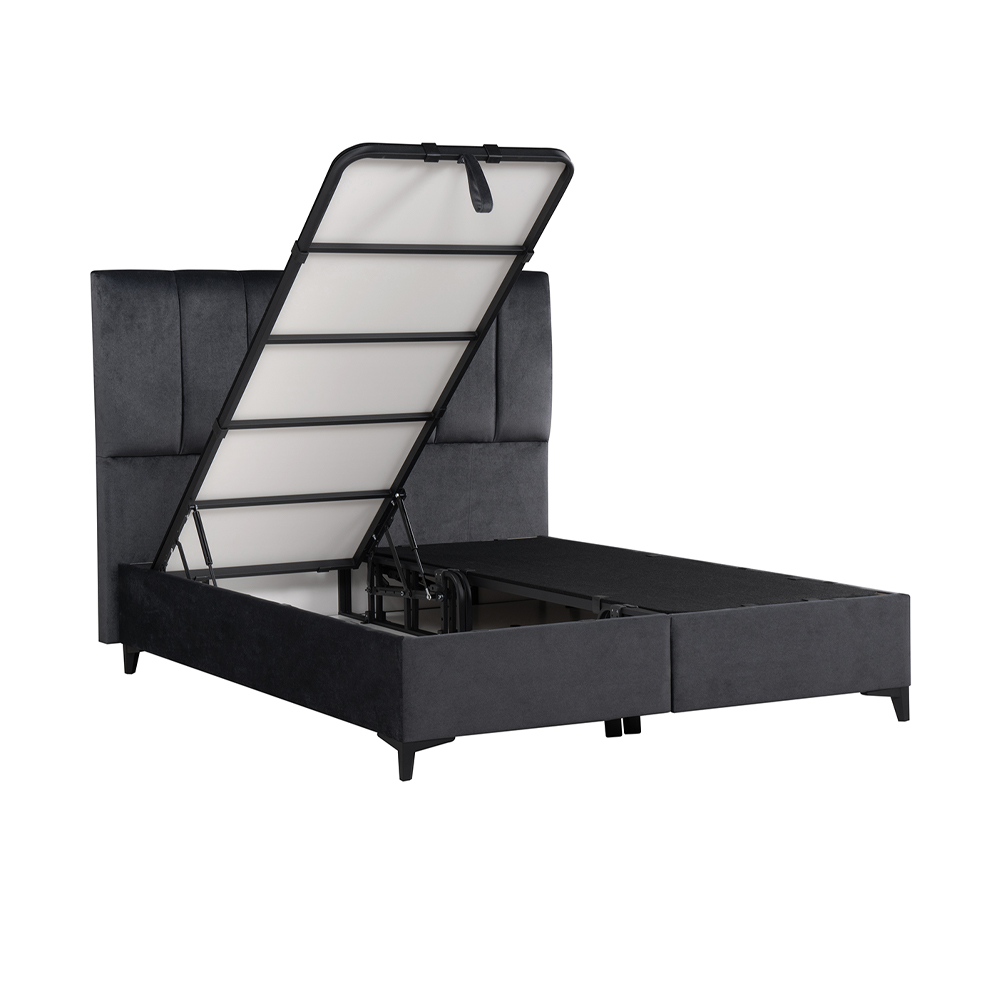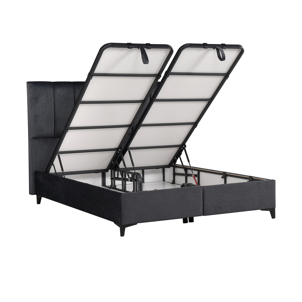 Κρεβάτι με αποθηκευτικό χώρο! Διαθέτει αεριζόμενο, αντιμικροβιακό, ευρύχωρο αποθηκευτικό χώρο και 4 αμορτισέρ ασφαλείας διπλής ενέργειας, που ανασηκώνουν εύκολα το στρώμα. Ειδική σχεδίαση και κατασκευή του κρεβατιού για απόλυτη απουσία τριγμών. Μεταλλικός σκελετός ηλεκτροστατικής βαφής, εξαιρετικής αντοχής, αντικραδασμικός. Πλαϊνά από οικολογική μελαμίνη, επενδυμένα με αφρώδες υλικό ύφασμα . Απόλυτα επίπεδη και ενιαία επιφάνεια, ιδανική για κάθε τύπο στρώματος .Η επιφάνεια του υποστρώματος είναι καλυμμένη με αντιολισθητικό ύφασμα για την καλύτερη συγκράτηση του στρώματος. Ο πάτος είναι από μελαμίνη πάχους 8mm και φέρει αεραγωγούς. Ψηλά ποδαράκια για εύκολο καθάρισμα.