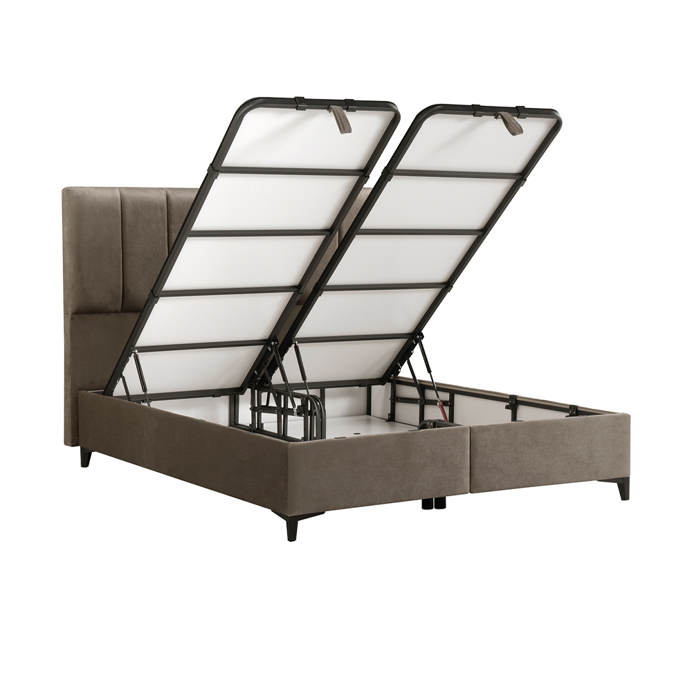 Κρεβάτι με αποθηκευτικό χώρο! Διαθέτει αεριζόμενο, αντιμικροβιακό, ευρύχωρο αποθηκευτικό χώρο και 4 αμορτισέρ ασφαλείας διπλής ενέργειας, που ανασηκώνουν εύκολα το στρώμα. Ειδική σχεδίαση και κατασκευή του κρεβατιού για απόλυτη απουσία τριγμών. Μεταλλικός σκελετός ηλεκτροστατικής βαφής, εξαιρετικής αντοχής, αντικραδασμικός. Πλαϊνά από οικολογική μελαμίνη, επενδυμένα με αφρώδες υλικό ύφασμα . Απόλυτα επίπεδη και ενιαία επιφάνεια, ιδανική για κάθε τύπο στρώματος .Η επιφάνεια του υποστρώματος είναι καλυμμένη με αντιολισθητικό ύφασμα για την καλύτερη συγκράτηση του στρώματος. Ο πάτος είναι από μελαμίνη πάχους 8mm και φέρει αεραγωγούς. Ψηλά ποδαράκια για εύκολο καθάρισμα.