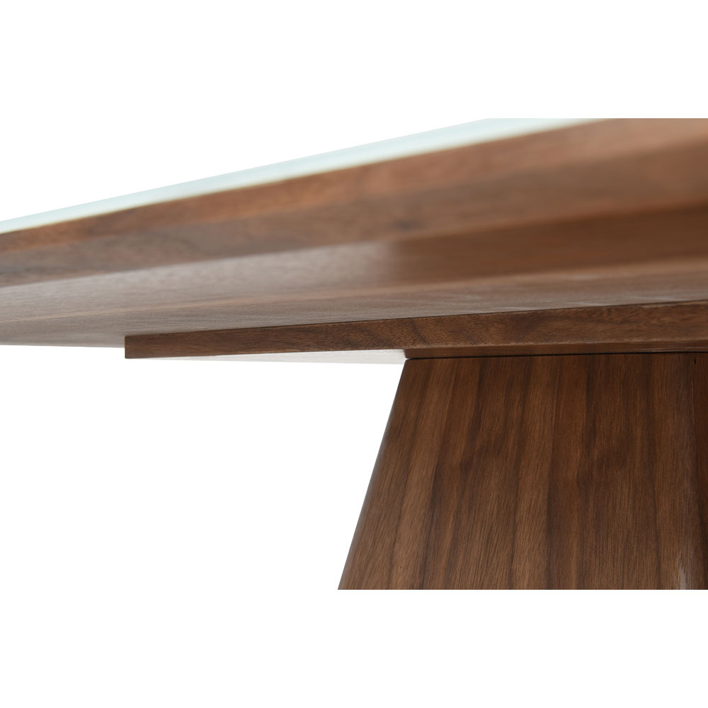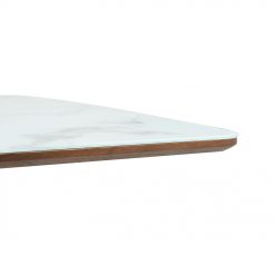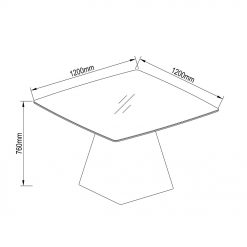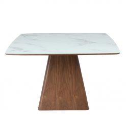 Το τραπέζι TOTEM συνδυάζει την κλασική ζεστασιά του ξύλου με την εκλεπτυσμένη υφή του γυαλιού με όψη μαρμάρου. Η τετράγωνη του επιφάνεια με διάσταση 120 cm είναι από γυαλί με φινίρισμα που παραπέμπει σε λευκό μάρμαρο, ενώ η κωνική βάση σε απόχρωση καρυδί από veneer δρυός προσφέρει σταθερότητα και αισθητικό ενδιαφέρον. Το τραπέζι αυτό αποτελεί μια statement επιλογή για κάθε μοντέρνο καθιστικό ή τραπεζαρία.
