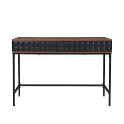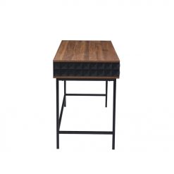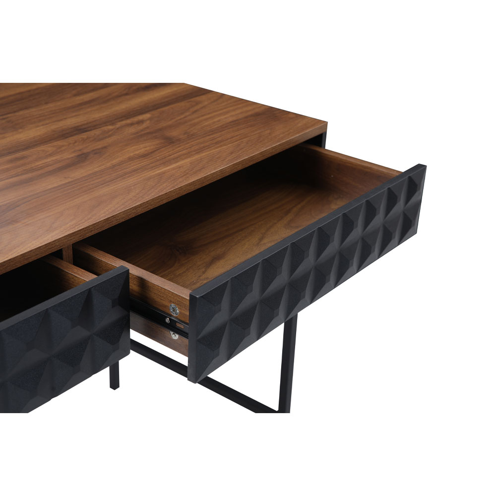 Το γραφείο Zuma ξεχωρίζει για τον εντυπωσιακό του σχεδιασμό και τη μοντέρνα αισθητική, καθιστώντας το ιδανικό για κάθε σύγχρονο χώρο εργασίας. Κατασκευασμένο από μελαμίνη σε απόχρωση καρυδιάς, προσφέρει μια ζεστή και εκλεπτυσμένη εμφάνιση. Διαθέτει δύο ευρύχωρα συρτάρια με όψεις που διακοσμούνται από μαύρες γεωμετρικές λεπτομέρειες, προσθέτοντας μια μοναδική και καλλιτεχνική πινελιά. Τα μαύρα μεταλλικά πόδια εξασφαλίζουν σταθερότητα και ανθεκτικότητα, ενώ ενισχύουν τον κομψό και βιομηχανικό του χαρακτήρα. Το Zuma είναι η τέλεια επιλογή για όσους αναζητούν εργονομία και εντυπωσιακό design στον χώρο εργασίας τους.