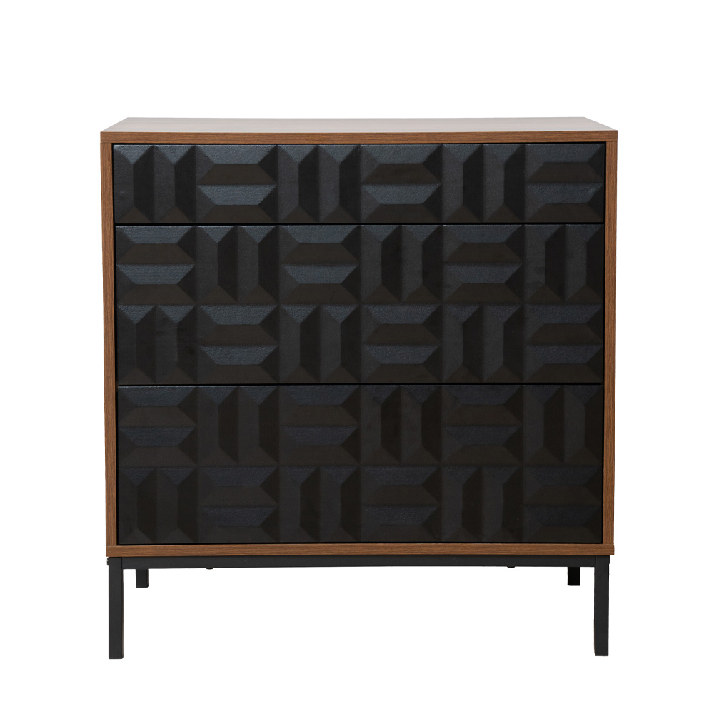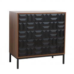 Η συρταριέρα Zuma είναι μια κομψή και μοντέρνα προσθήκη για κάθε χώρο. Κατασκευασμένη από μελαμίνη σε απόχρωση καρυδιάς, διαθέτει τρία συρτάρια με μαύρες γεωμετρικές λεπτομέρειες που προσδίδουν μοναδικό χαρακτήρα. Η βάση της είναι εξοπλισμένη με μαύρα μεταλλικά πόδια, προσφέροντας σταθερότητα και στυλ. Ιδανική επιλογή για να οργανώσετε τον χώρο σας με φινέτσα και πρακτικότητα.